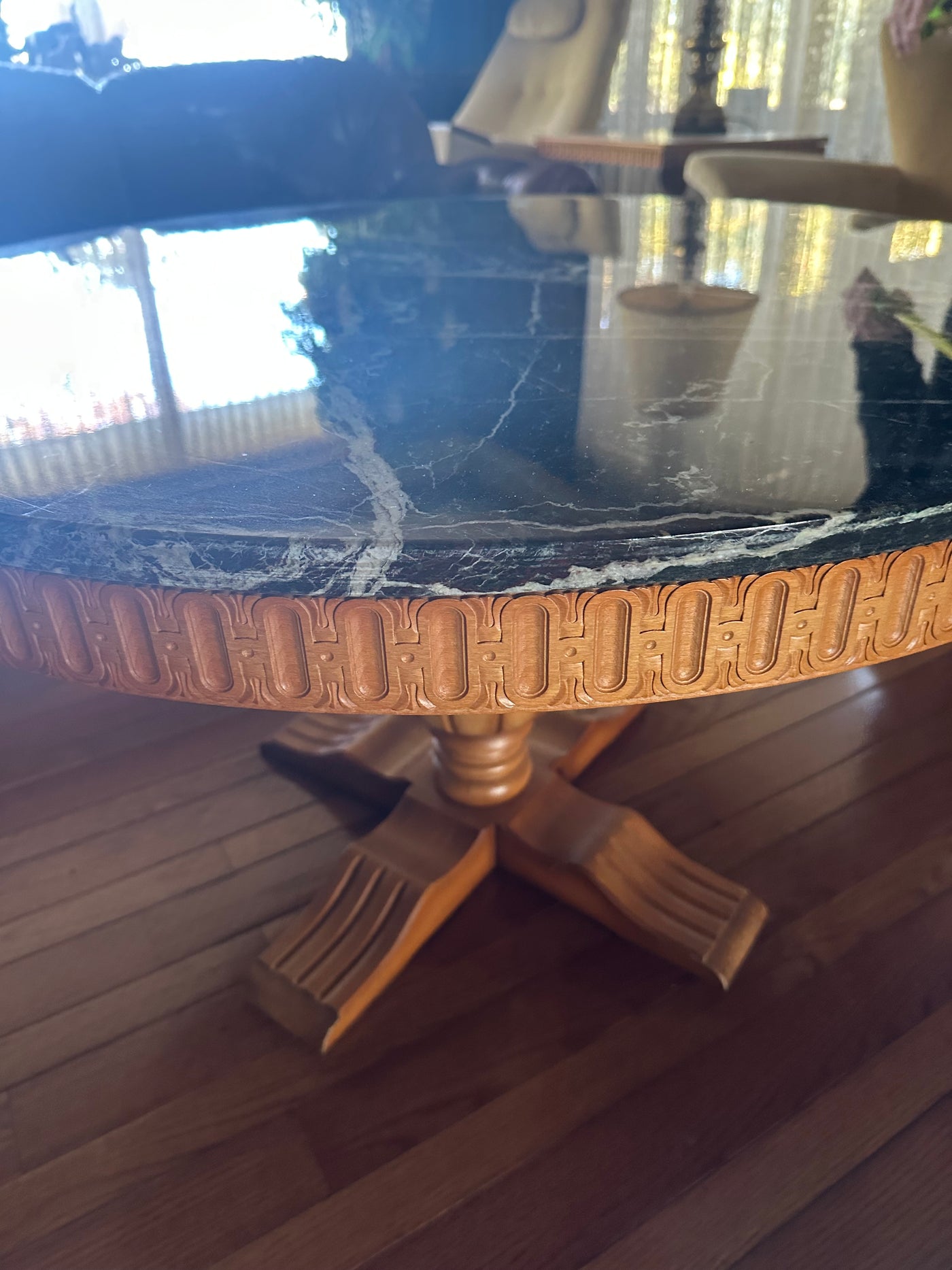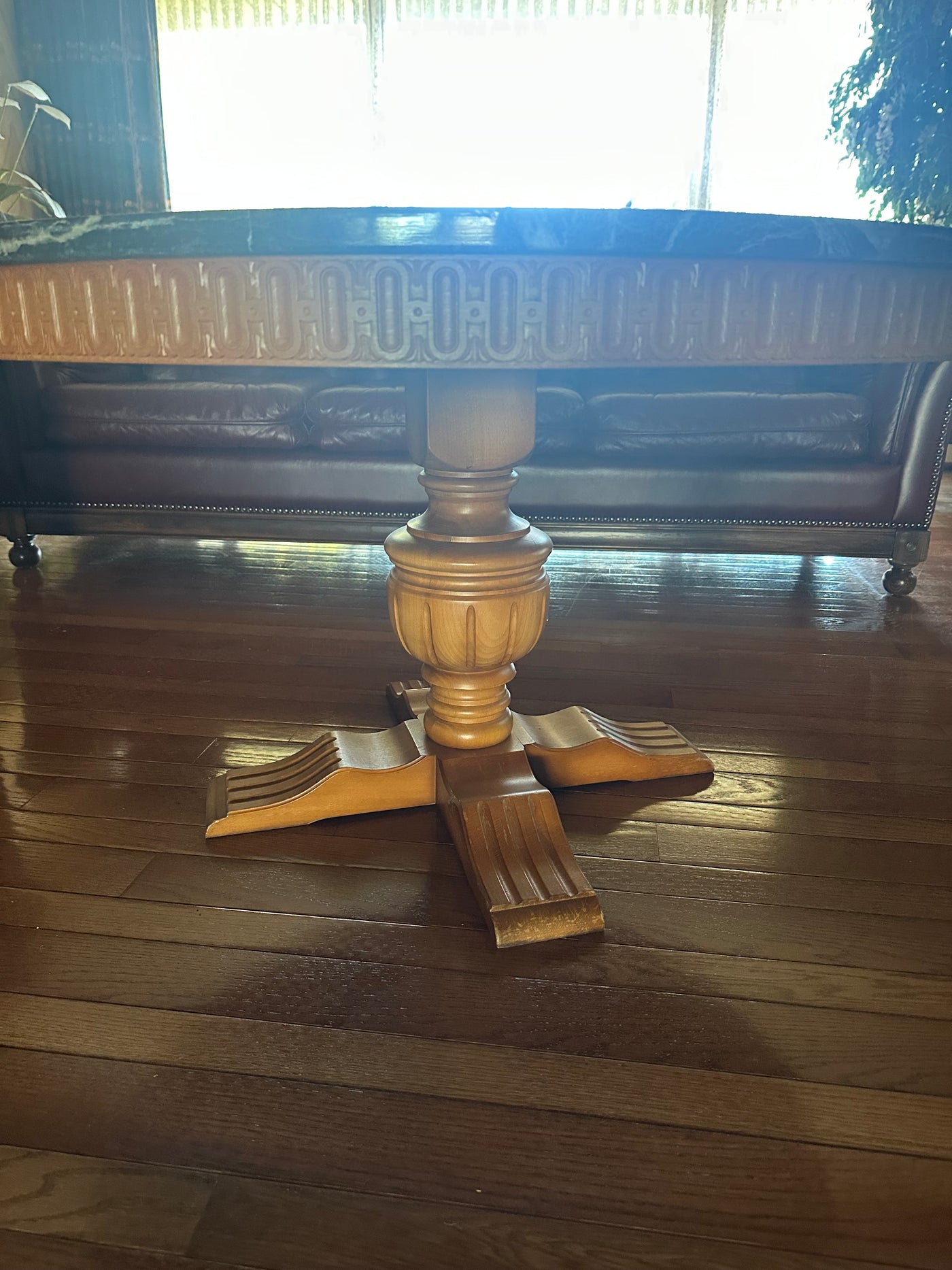 Lot as pictured. Table is in excellent condition. Measures 39.5”D x 23.5”H.