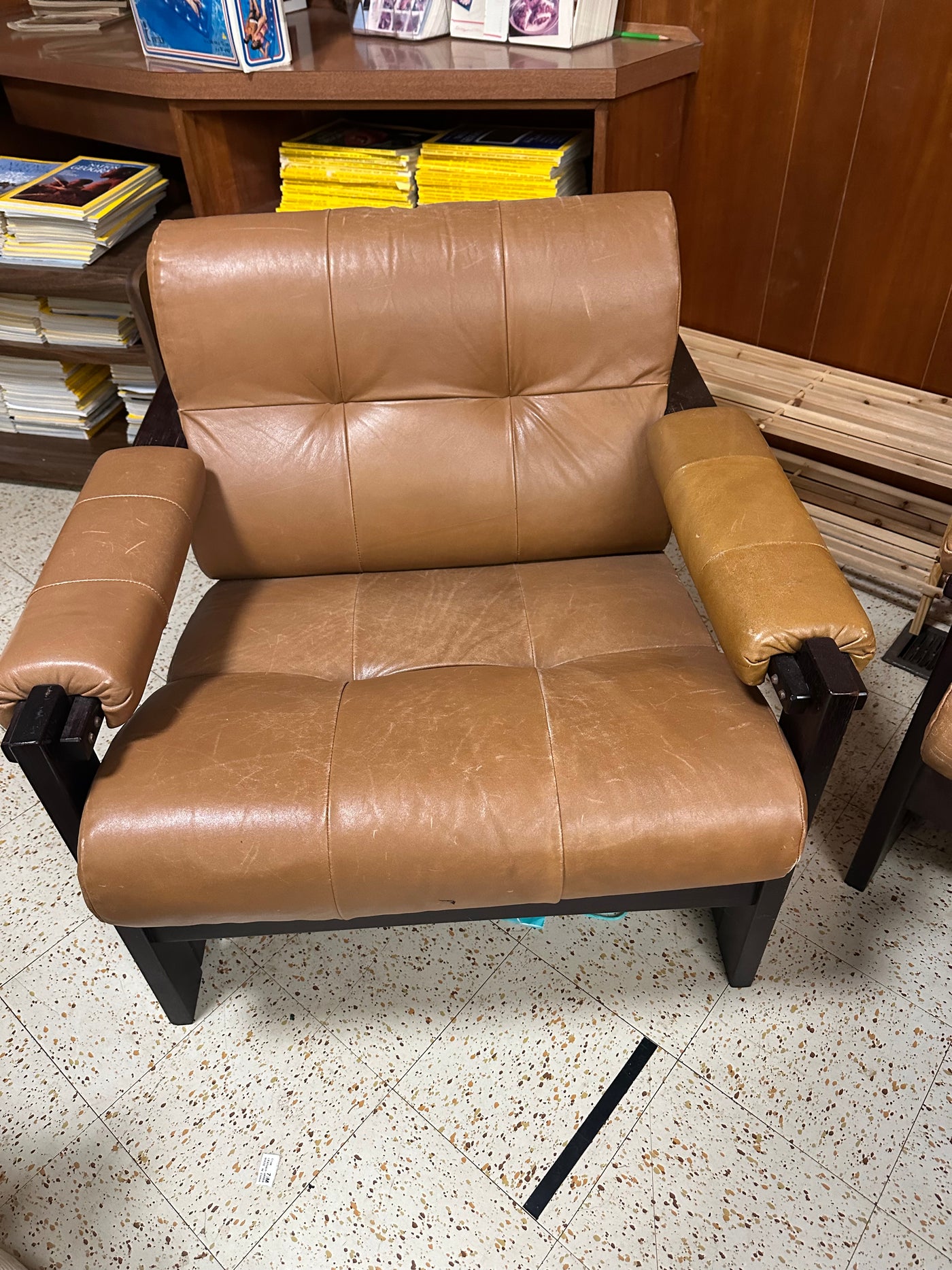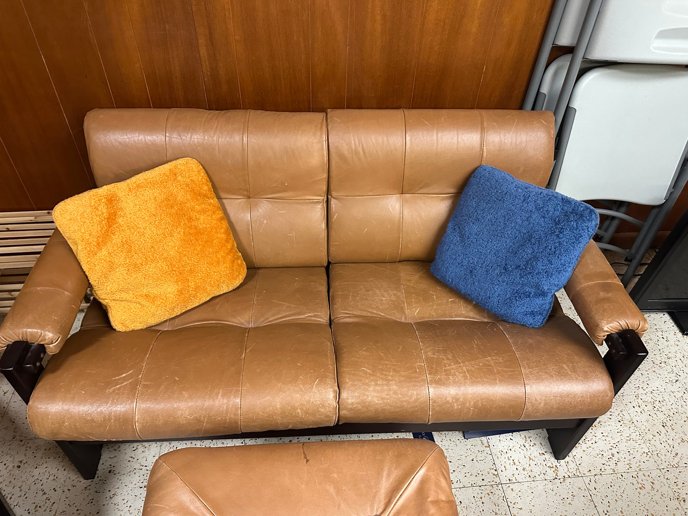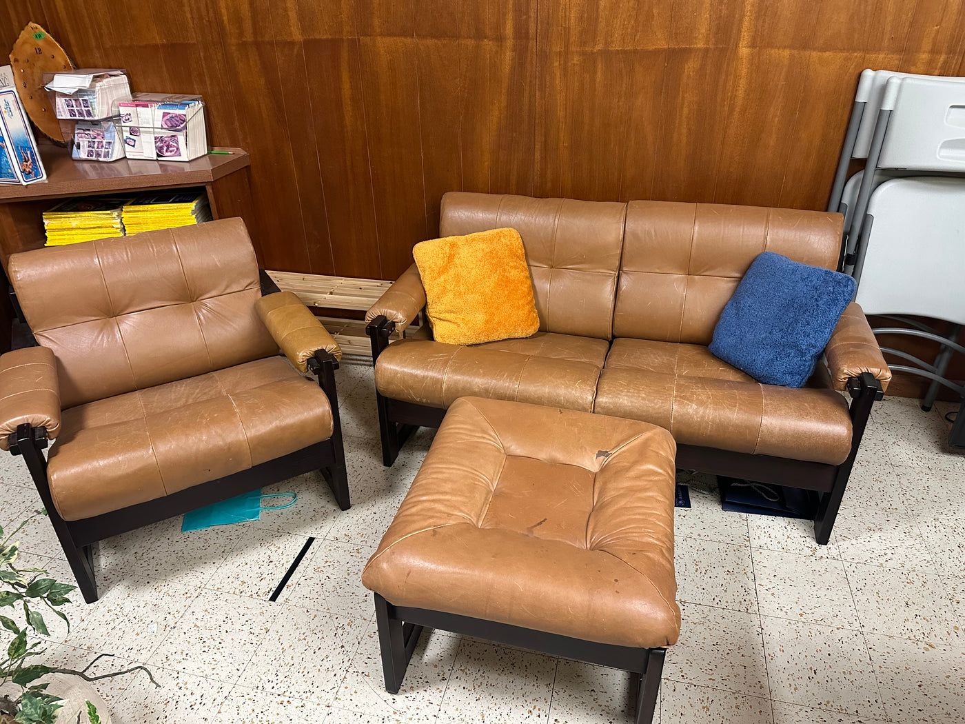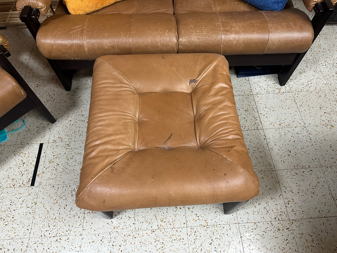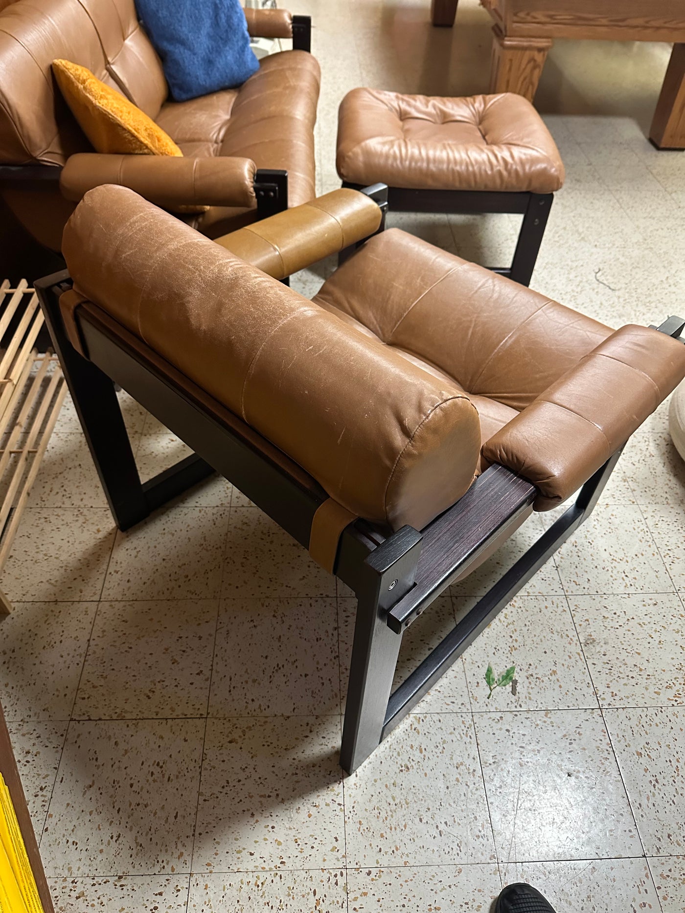 Lot as pictured. Loveseat measures 54 x 22 x 29”H. Chair measures 32 x 32 x 29”H. Ottoman measures 24 x 24 x 14”H. It will need a good leather cleaning and condition. There is staining on the ottoman as seen in the photo.