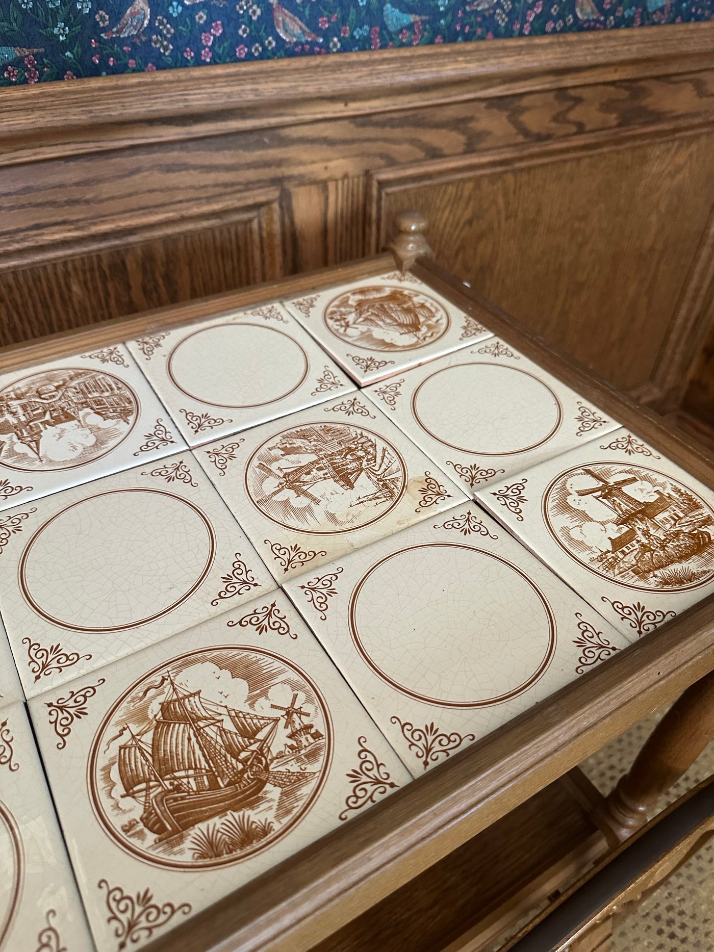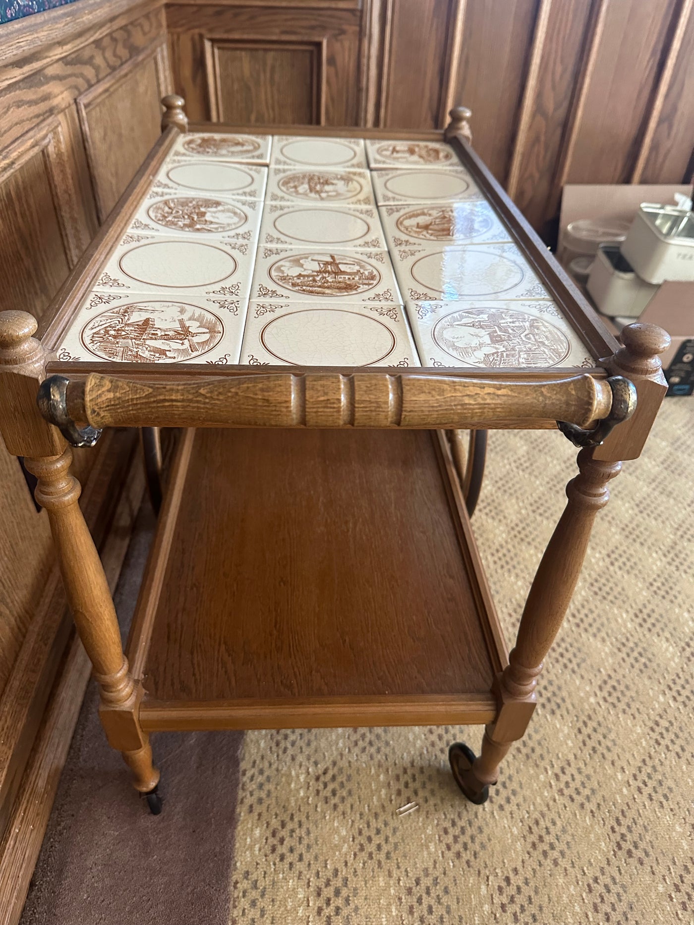 Lot as pictured. Measures 34 x 22 x 26”H. Cart top has some popping tiles. None are cracked/broken.