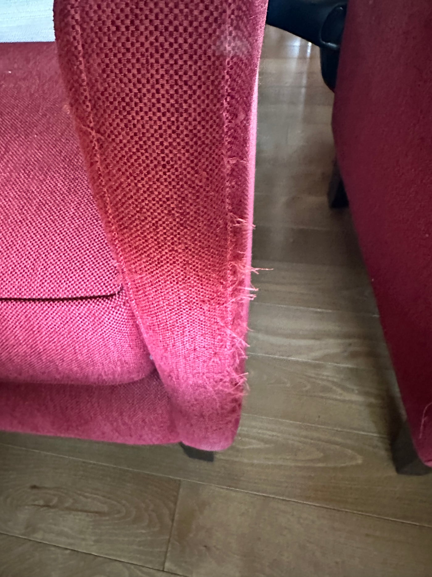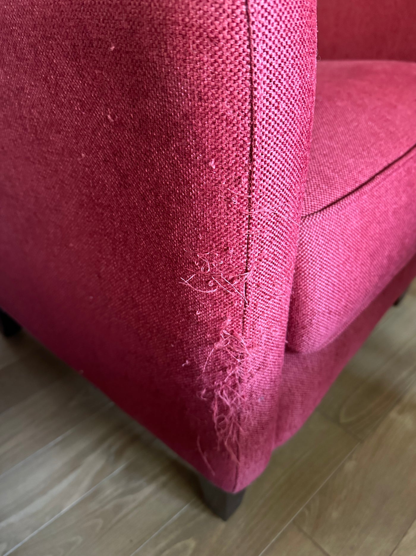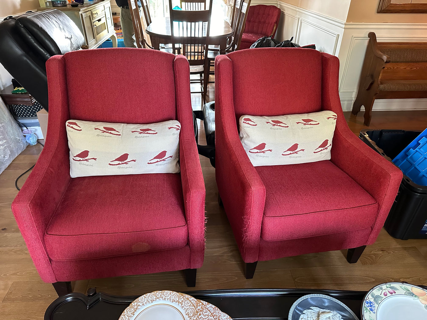 Lot as pictured. Measures 28 x 30 x 39”H. There is fabric pulls on both chairs and staining on the front of one as shown in photo. Price for the set of chairs