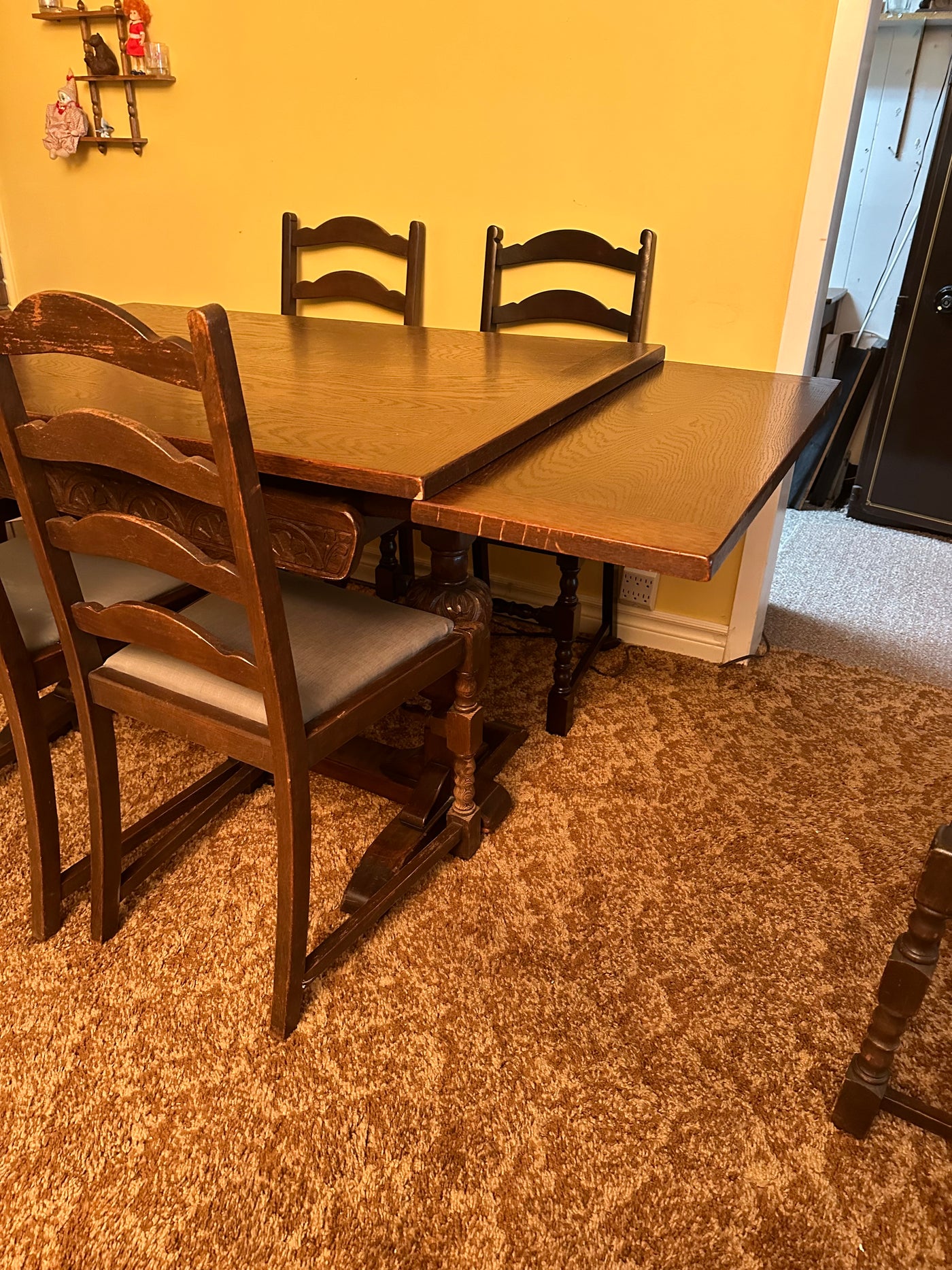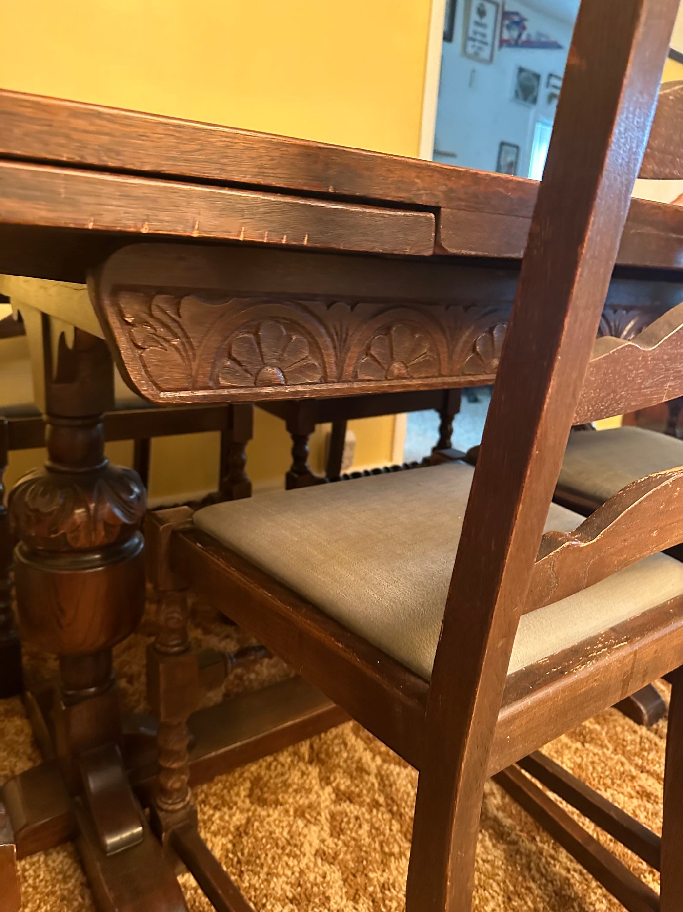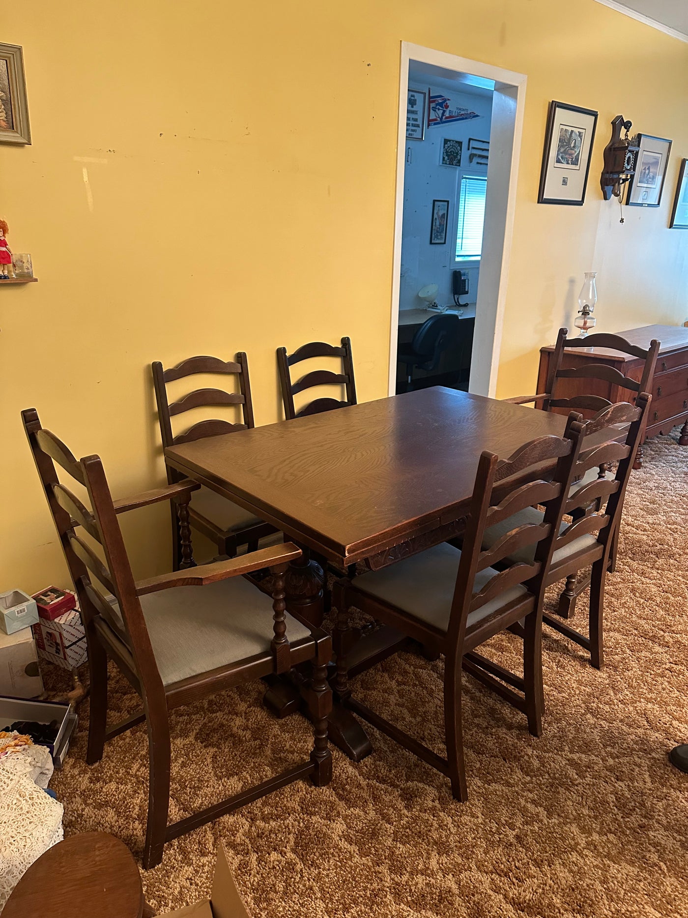 Lot as pictured. Measures 48 x 32 x 30”H. With 2 built in 12” extensions. 6 chairs, 2 captain. Some age wear as pictured