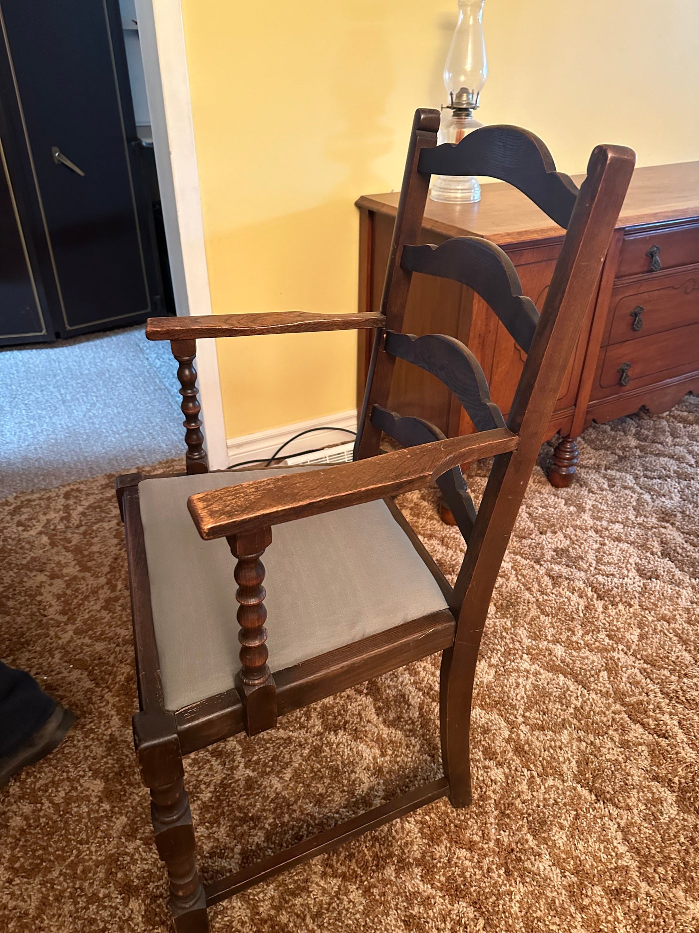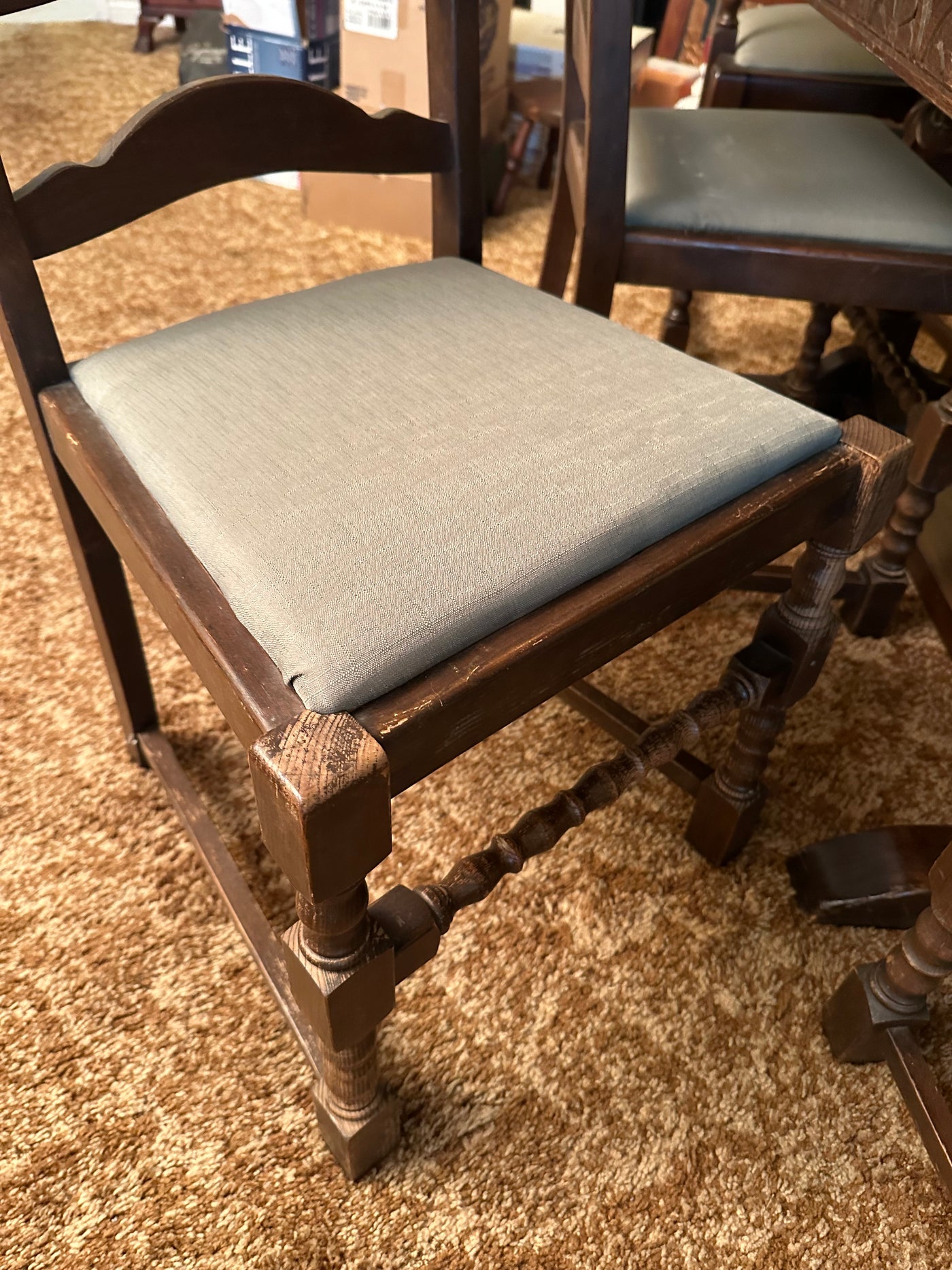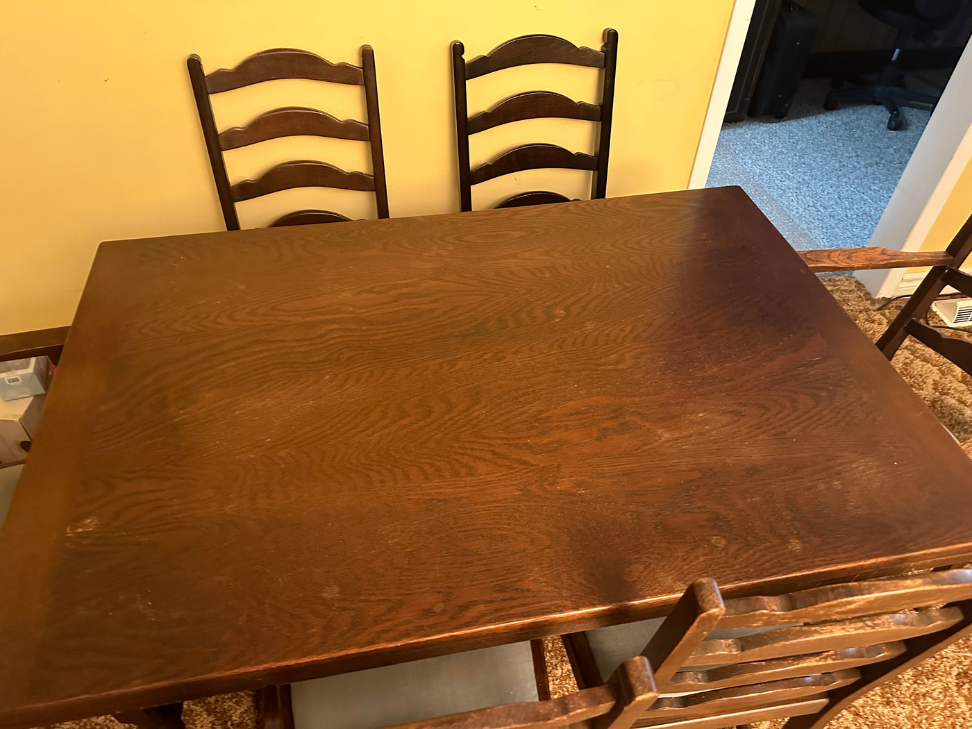 Lot as pictured. Measures 48 x 32 x 30”H. With 2 built in 12” extensions. 6 chairs, 2 captain. Some age wear as pictured