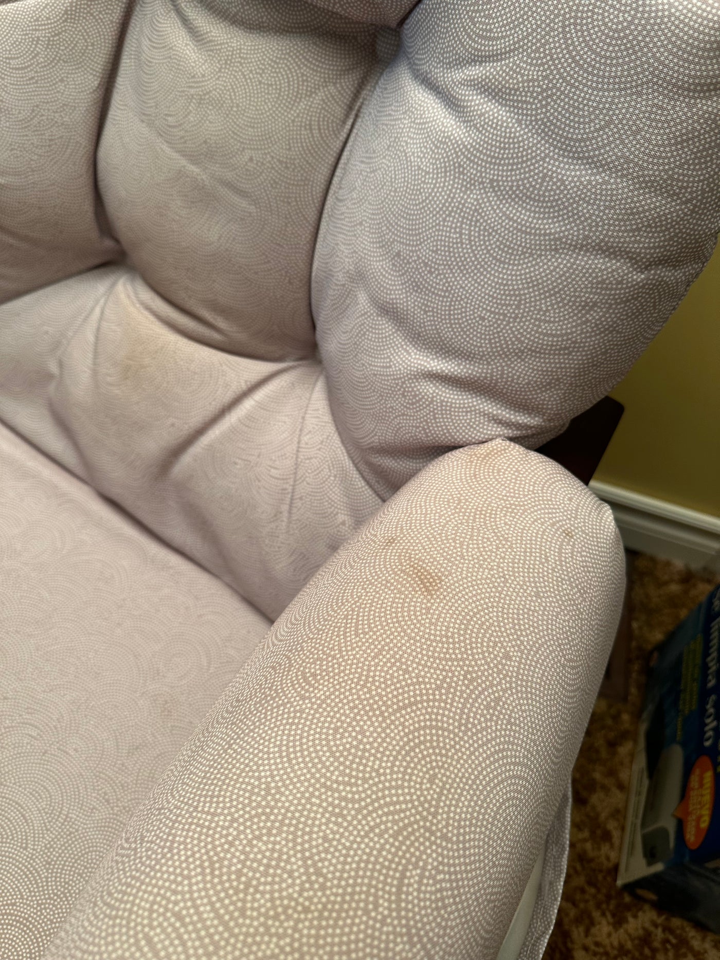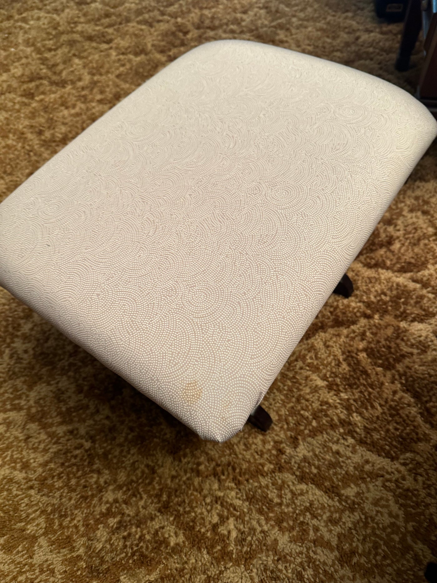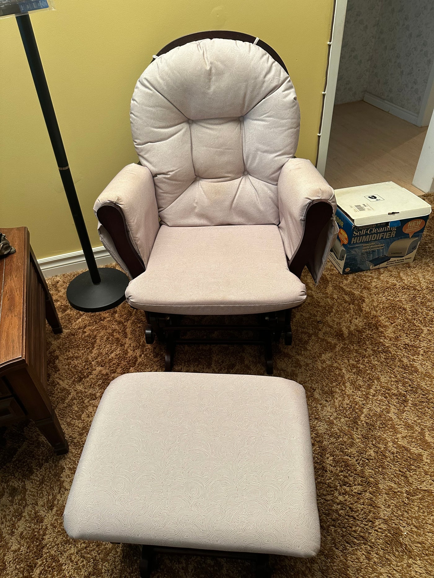 Lot as pictured. Measures 30 x 32 x 38”H gliding ottoman measures 20 x 16 x 14”H. Some staining on fabric as shown